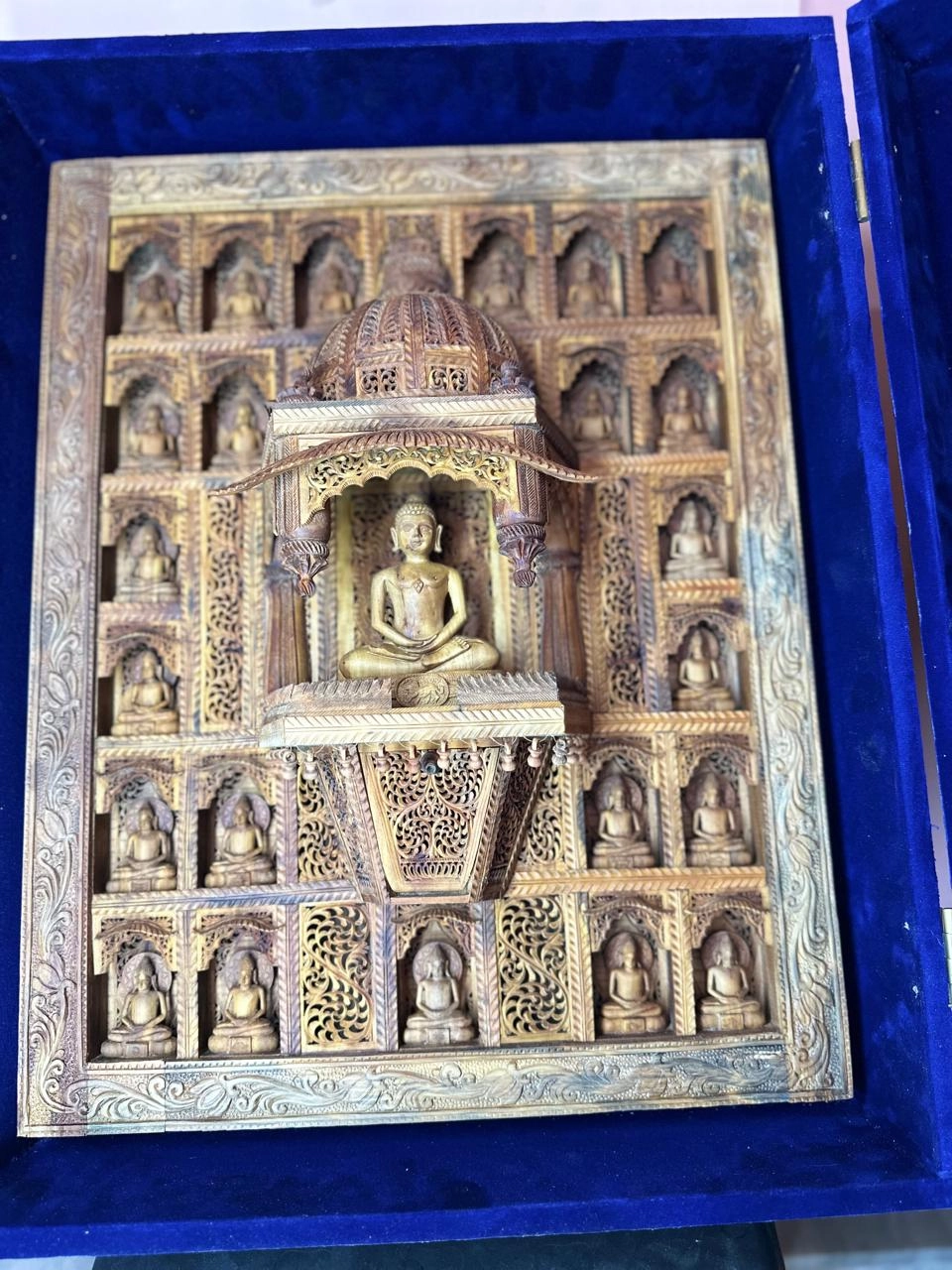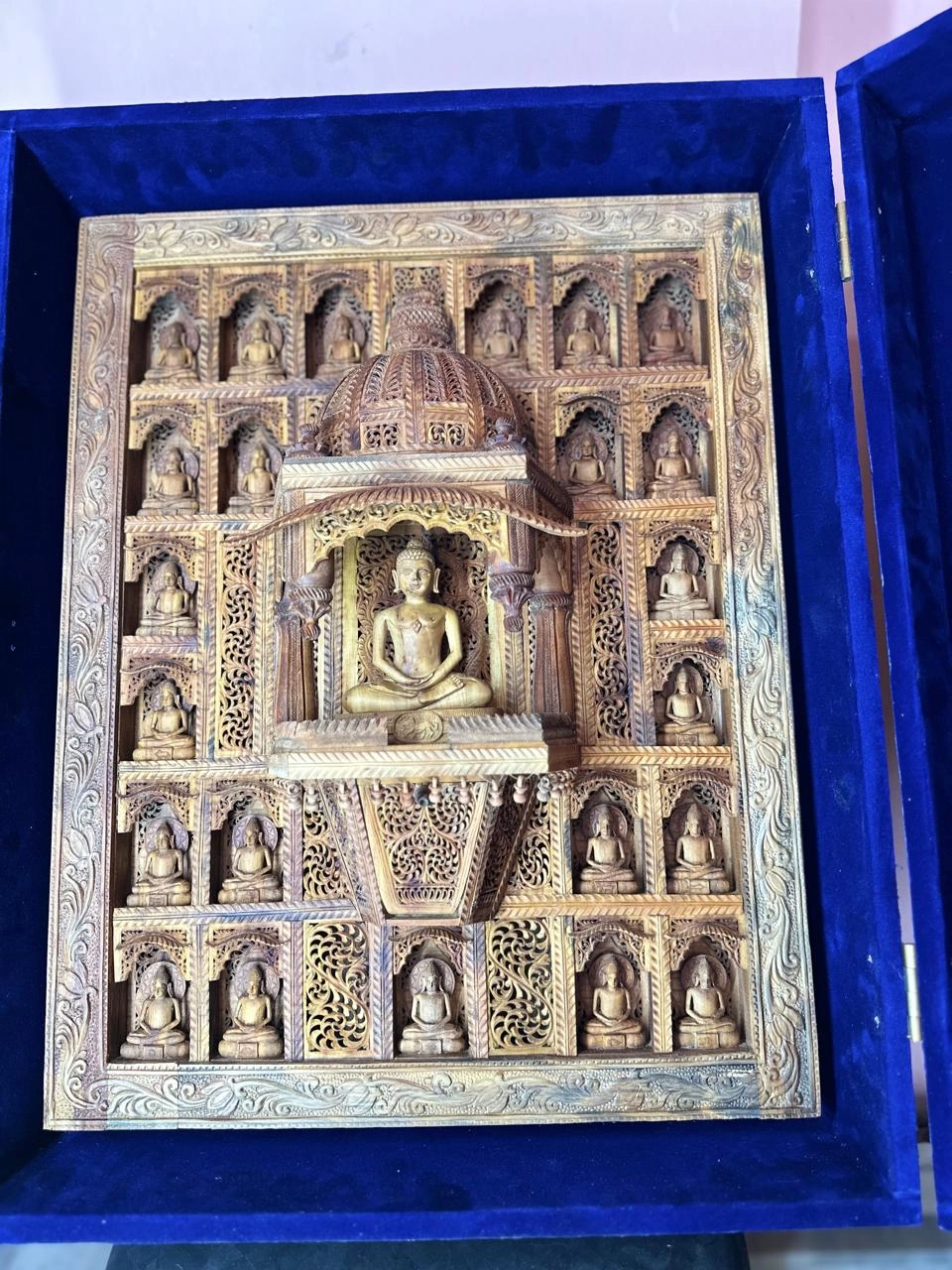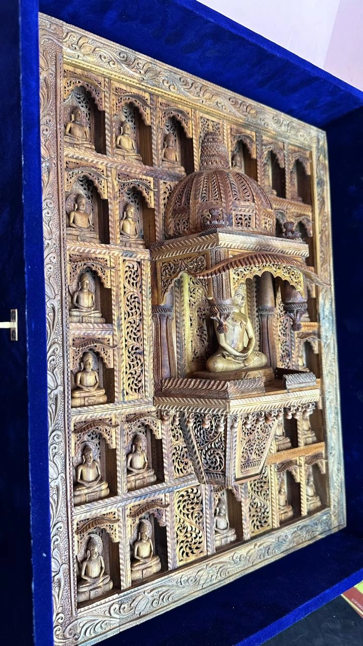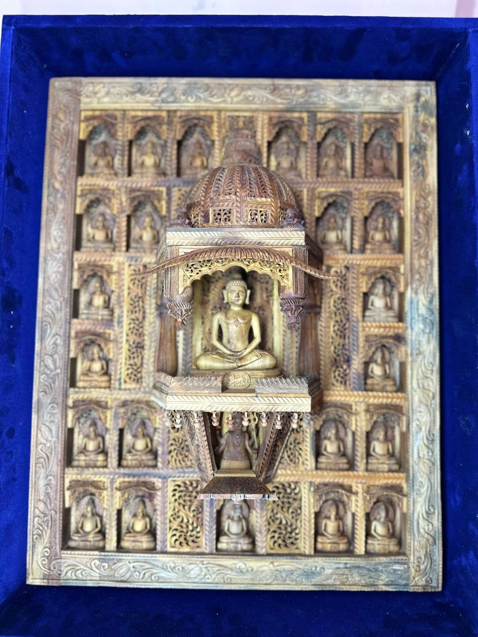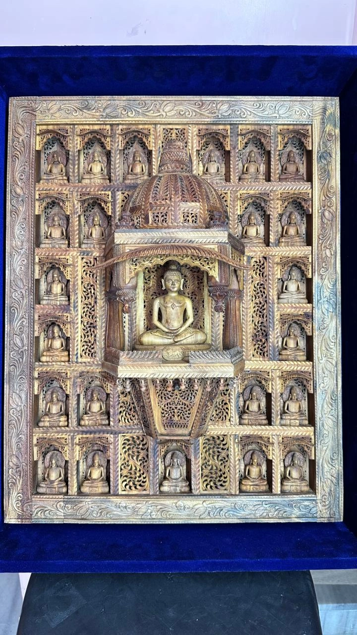 A finely crafted wall-hanging panel in genuine sandalwood featuring the 24 Tirthankaras of Jainism. Lord Mahavir is prominently placed at the center, with the remaining 23 Tirthankaras arranged around him. Each deity is represented with a traditional symbol beneath the idol for easy identification. The piece includes a small opening window that reveals Bhairav (guardian deity) inside, adding a distinctive devotional detail.